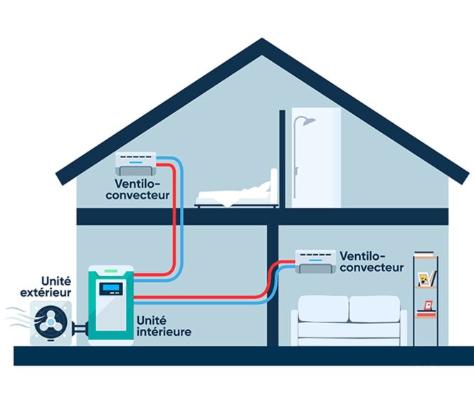 La pompe à chaleur Air / Air capte les calories présentes dans l’air extérieur pour les transformer en énergie thermique. Cette énergie est ensuite diffusée directement dans le logement sous forme d’air chaud en hiver et d’air frais en été, grâce aux unités intérieures installées dans les différentes pièces. Ce système permet de bénéficier d’un confort thermique réversible toute l’année, tout en améliorant la qualité de l’air intérieur et en maîtrisant la consommation énergétique.